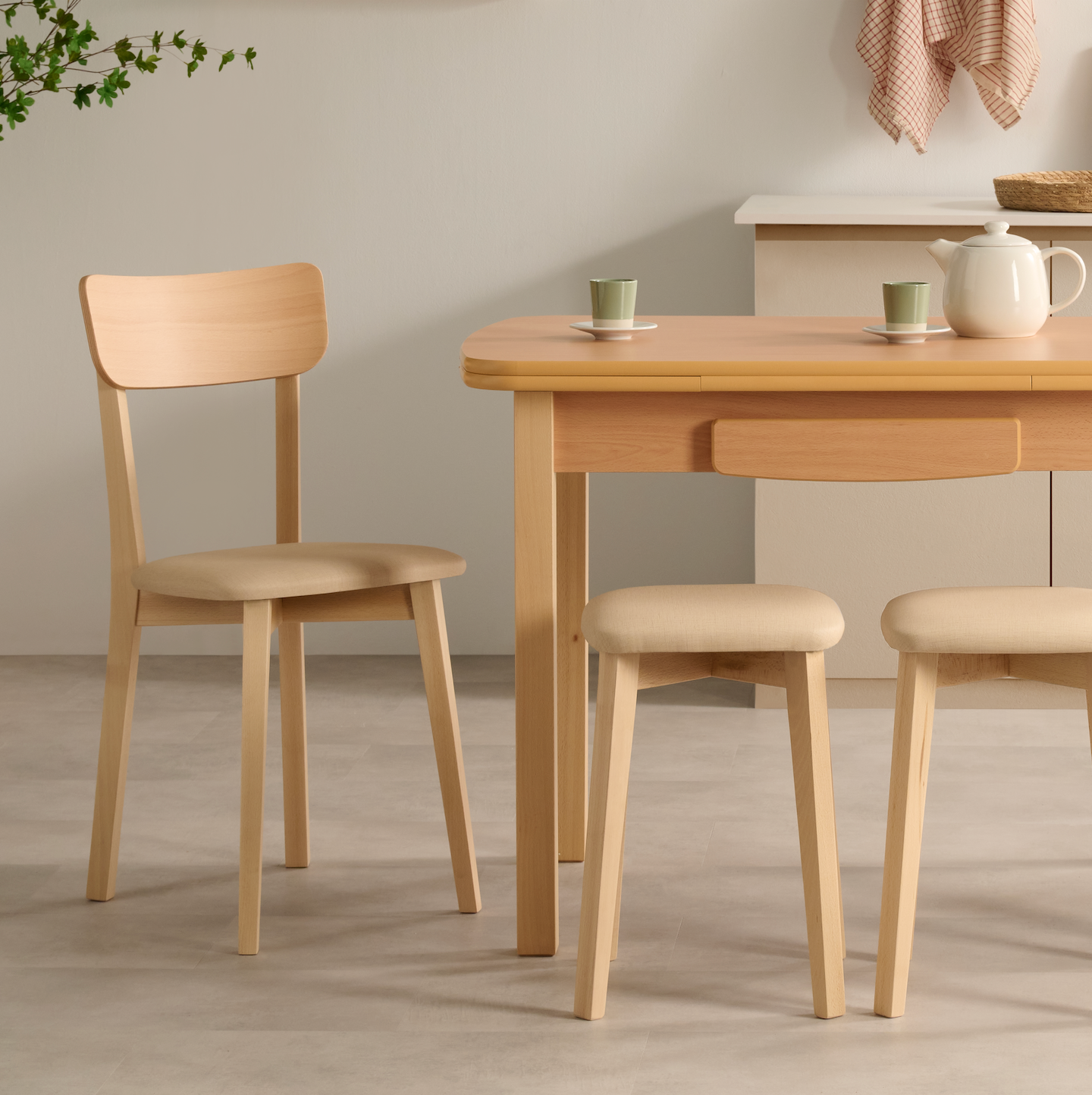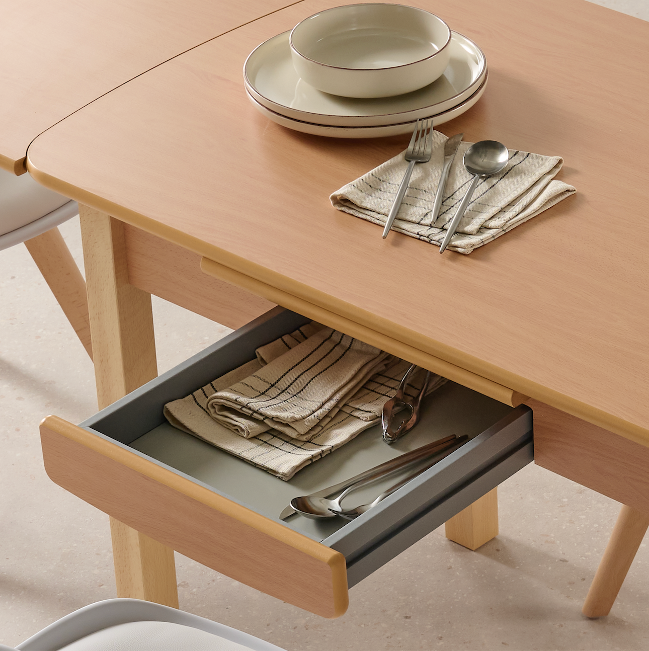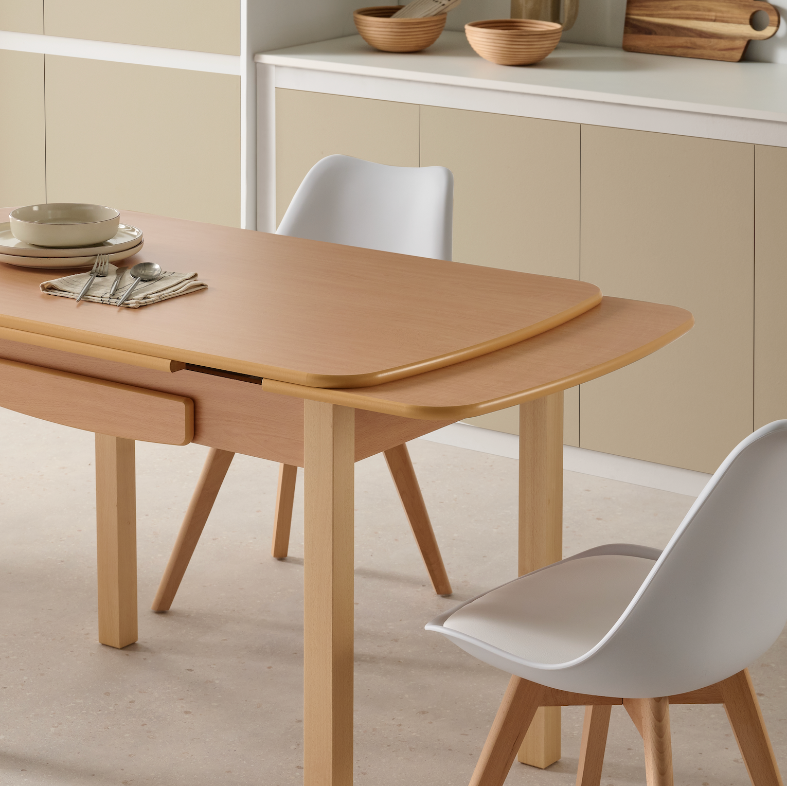 Mesa de cocina extensible con cajón y patas de madera de haya