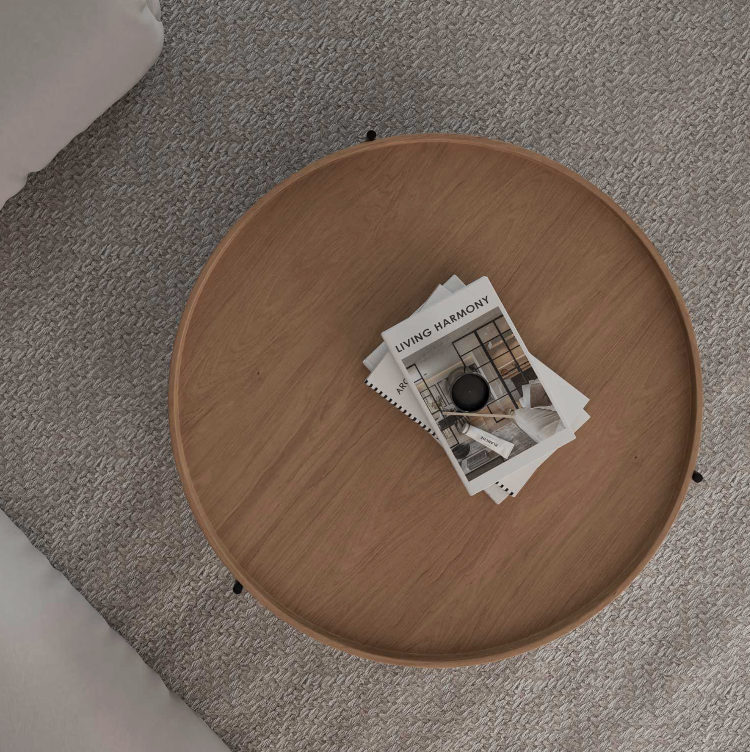 Mesa de centro o auxiliar de 50cm de diámetro en color Roble o Negro y patas metálicas negras.