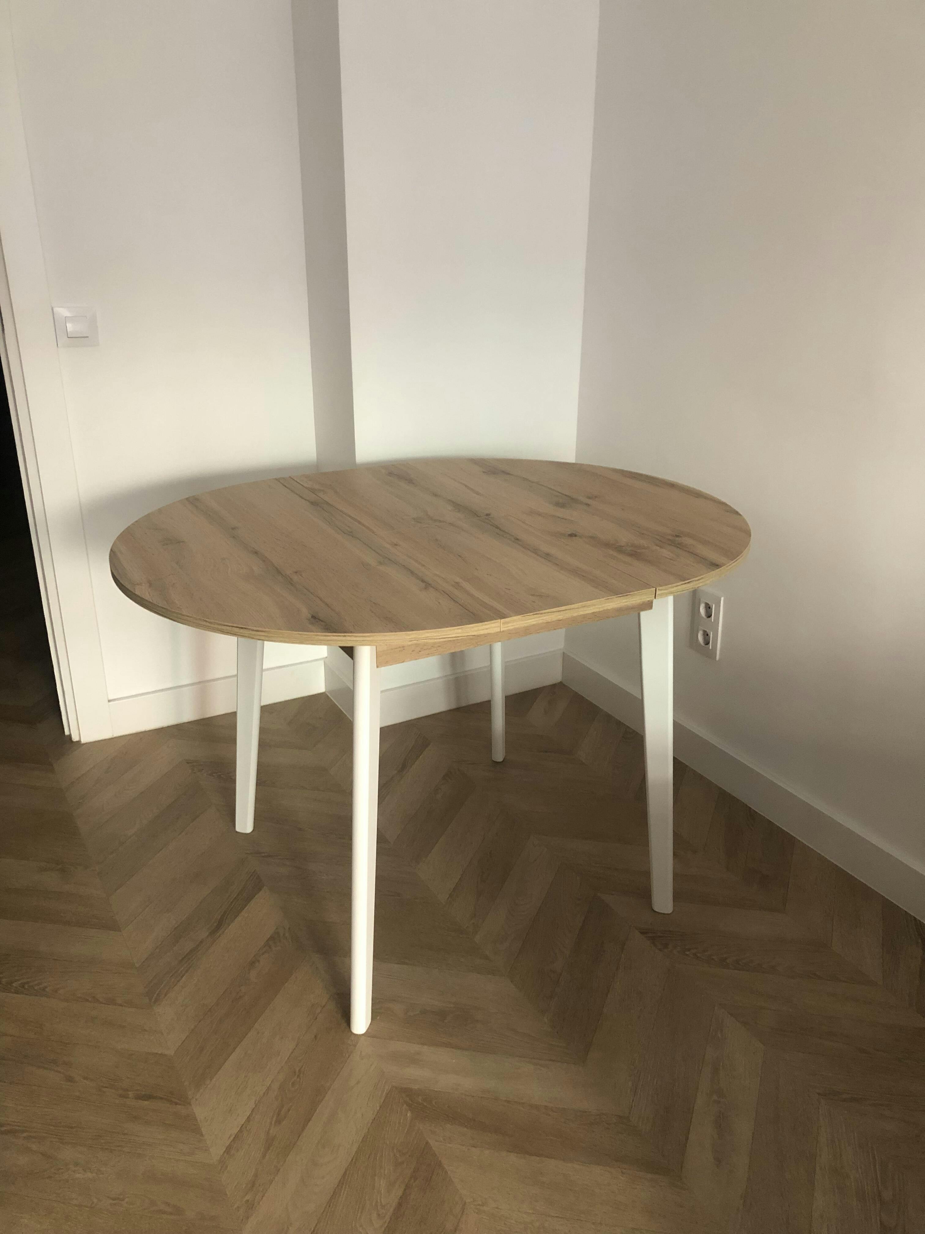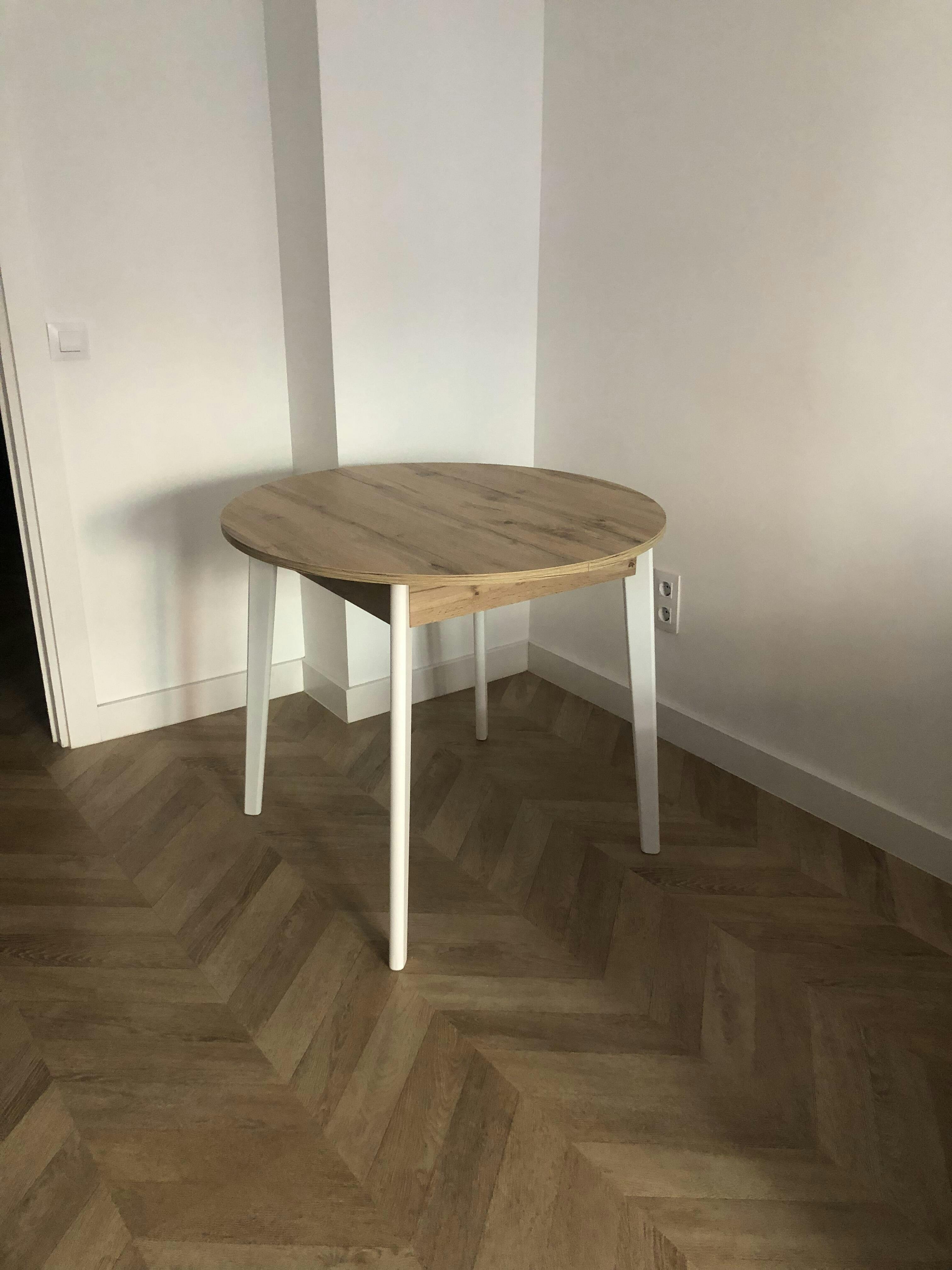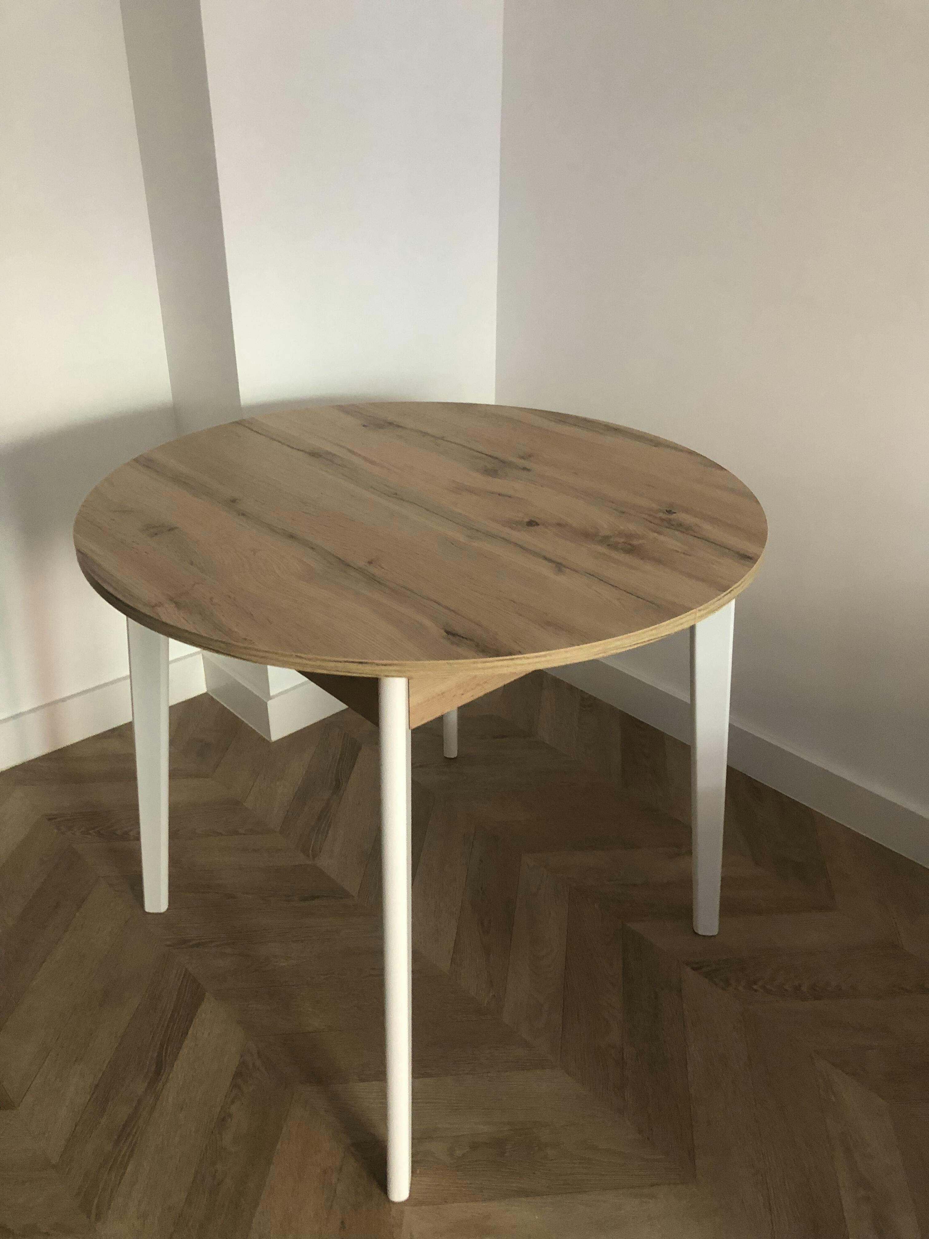 Mesa redonda 90cm color roble con patas blancas o negras.