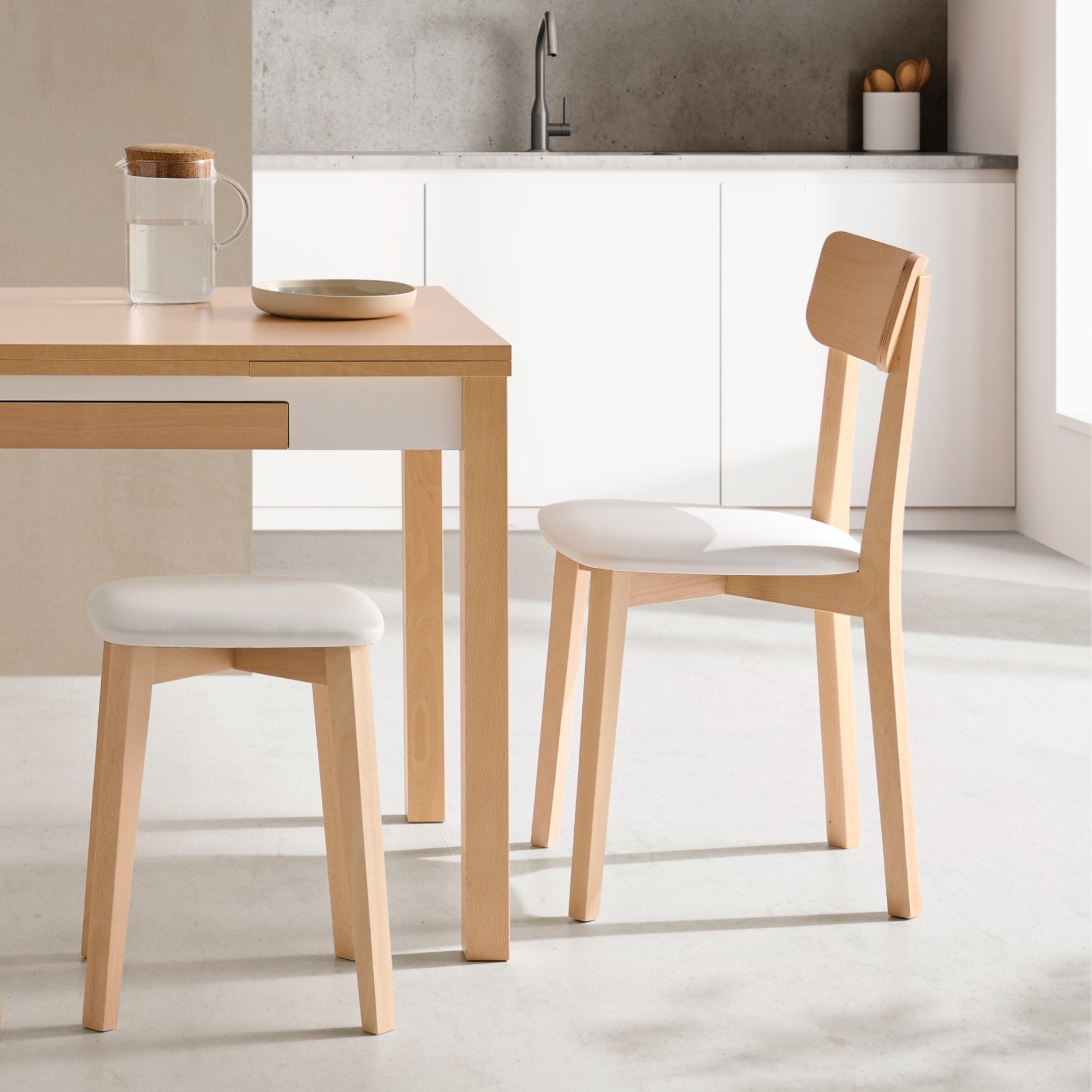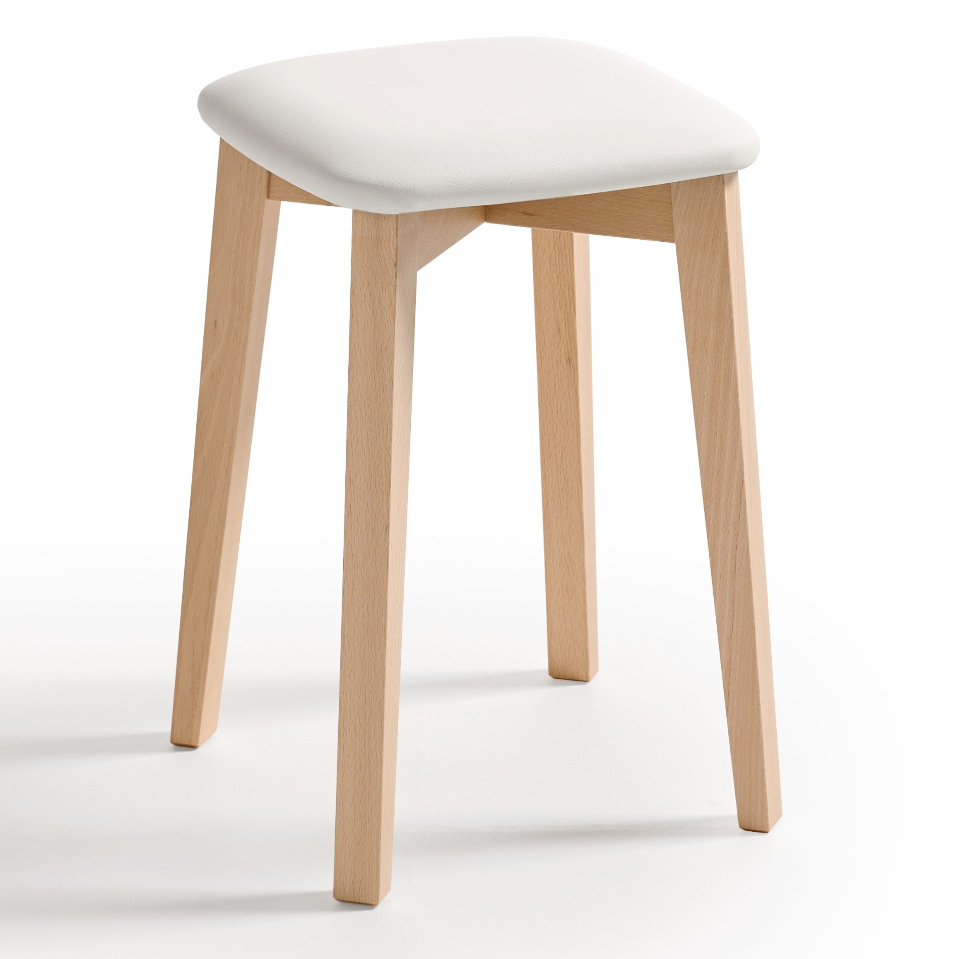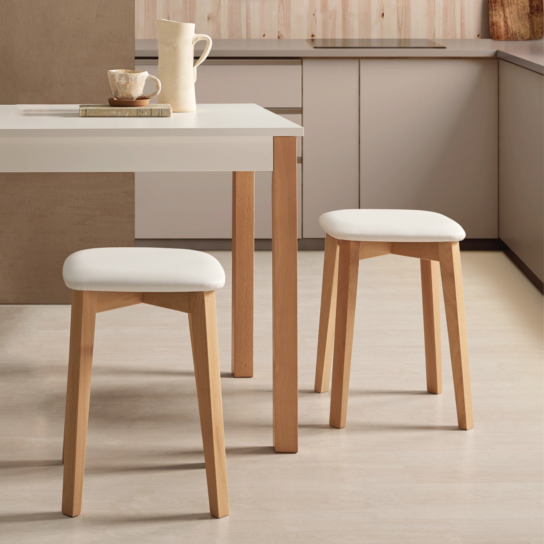 Taburete de cocina bajo de madera de haya con asiento de piel sintética